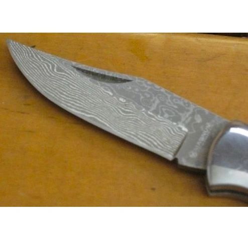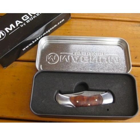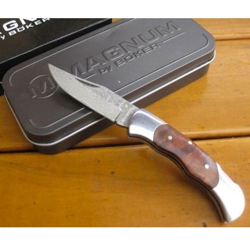 The Boker Magnum Lady Damascus Pocket Knife features a 2 3/8" clip point blade made of genuine forged Damascus steel with 37 layers and a nail nick for opening. The burl wood handle of this Magnum knife, 3 1/8" closed, has polished stainless steel bolsters and a lock back. The Boker Magnum Lady Damascus Pocket Knife has an overall open length of 5 1/2" and weighs 2.4 ounces. A Presentation/Storage/Gift Tin is Included. Part Number MB788DAM