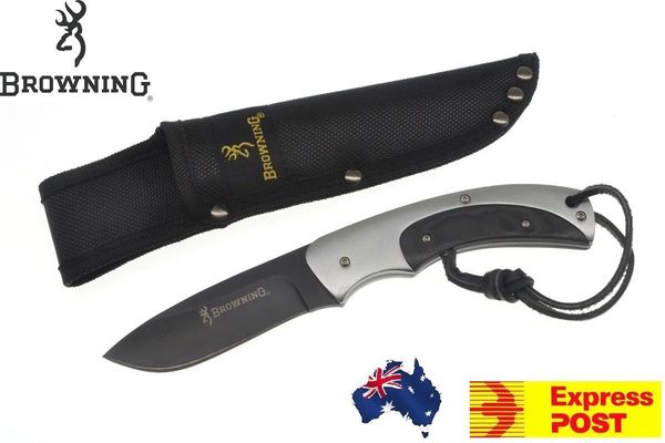 Browning Obsession Fixed Blade Knife. 8 1/4" overall length. 3 5/8" Sandvik 12C27 Stainless Steel Black Coated Drop Point blade. Dark Silver Stainless Steel handles with Black G-10 Inserts. Black leather lanyard. Comes with Black Nylon belt sheath. Made in China