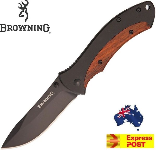 4 1/2" closed. 3 1/2" black finish stainless drop point blade. Black composite handles with brown wood insert on front handle. Lanyard hole. Stainless pocket clip. Made in China.
