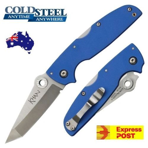 The Cold Steel Khan is a lightweight, durable everyday carry pocket knife designed by custom knife maker Mike Wallace. Its sturdy 3" blade is made from expertly heat treated cryo-quenched Japanese AUS-8 stainless steel, providing an excellent balance between edge-holding and ease of re-sharpening. The Khan’s blade is also equipped with the HTR - an innovative thumb opening feature designed by Andrew Demko - to allow for a secure and positive grip on the blade for ambidextrous deployment, adding to this tough little knife’s practicality and functionality. The contrasting grinds of the Khan’s line-grain satin polished American Tanto blade contrast beautifully with its rich blue G10 handle scales and bead blasted pocket clip, adding good looks and a touch of style to this practical utility knife and tool. Easy to carry, easy to use, and easy on the wallet– the Khan is a knife you’ll be proud to carry in your pocket every single day!