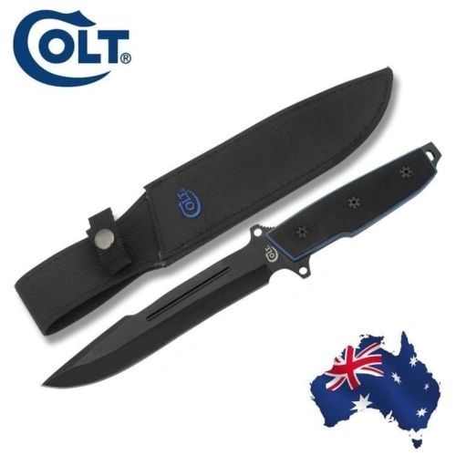 Colt Tactical Bowie. 13 3/4" overall. 8" black finish stainless bowie blade. Full extended tang with lanyard hole. Blue G-10 handles with textured black G-10 onlays. Black nylon belt sheath.