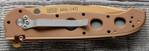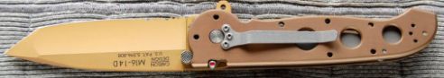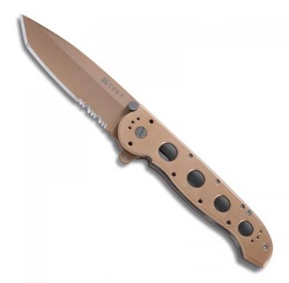 M16®-14D Desert Big Dog has an aluminum frame M16 in desert camo. The contoured handles of 6061 T6 aluminum are hard anodized Desert Tan. The 3.875" (98 mm) AUS 8 stainless steel blade, chosen for edge retention and durability, receives a highly corrosion-resistant Desert Tan non-reflective titanium nitride coating. It has a Combined Razor-Sharp and Triple-Point™Serrated edge to cut through nets, webbing and vegetation quickly.