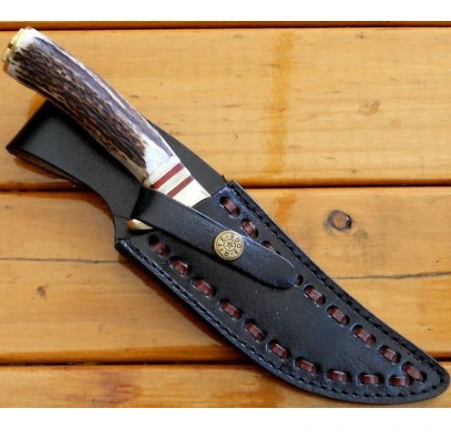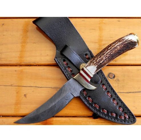 If you are the type of person who demands Smooth Lines, Exceptional Balance, Quality, and Rarity in their Hunting Knife, this outstanding 258mm Damascus Steel Skinner complete with Custom Leather Sheath, will fit the bill. From pummel to point, this knife is superior in quality. 5mm full tang thick Damascus blade. The knife is constructed with 180 layers of AIS 1084 (consists of high carbon) steel and AIS 1250 (low carbon steel). The handle(25mm thick) is SOLID STAG HORN (SAMBAR DEER – NOT A PROTECTED SPECIES) , fitted to the tang. 15mm of the handle towards the guard is made of 2 layers rich wood and 2 layers bone. In fact, the knife you receive will be a one of a kind, as no 2 blades can ever be identical. Comes with a THICK solid cow hide sheath which may fit to your belt. Please note, the sheath alone is designed for this knife and is 1 piece leather (not reconstituted leather) and retails over $40. If you have been looking for that Custom knife to carry that will turn heads whether in the sheath or out, this knife is for you! The guard/bowter is made of SOLID POLISHED BRASS. The bowie knife is 258mm overall length and the blade is 135mm long, and 5mm thick. Please see the pics and get in fast to secure one of the best quality knives you will ever come by! |