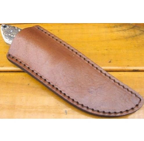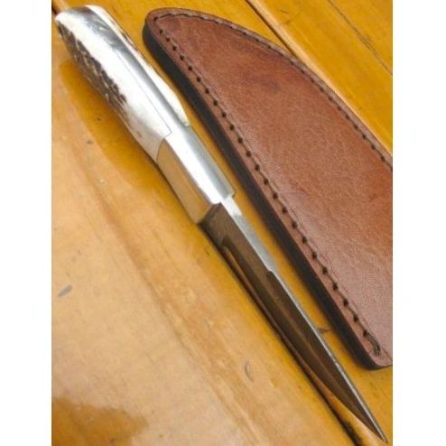 If you are the type of person who demands Smooth Lines, Exceptional Balance, Quality, and Rarity in their Hunting Knife, this outstanding 200mm Damascus Steel Skinner complete with Custom Leather Sheath, will fit the bill. From pummel to point, this knife is superior in quality. 4mm full tang thick Damascus blade. The knife is constructed with 180 layers of AIS 1084 (consists of high carbon) steel and AIS 1250 (low carbon steel). The handle(21mm thick) is SOLID STAG HORN , fitted to the tang with 3 stainless steel pins with a NICKEL PLATED FINGER GUARD. In fact, the knife you receive will be a one of a kind, as no 2 blades can ever be identical. Comes with a THICK solid cow hide sheath which may fit to your belt. Please note, the sheath alone is designed for this knife and is 1 piece leather (not reconstituted leather) and retails over $30.