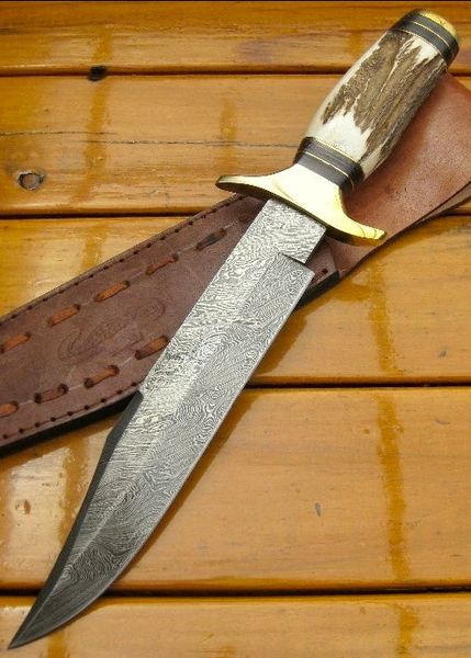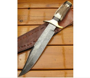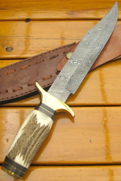 CUSTOM MADE DAMASCUS - LARGE - BOWIE Bush Hunting Knife – STAG HORN DEER - HAND