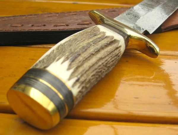 If you are the type of person who demands Smooth Lines, Exceptional Balance, Quality, and Rarity in their Hunting Knife, this outstanding 354mm Damascus Steel Hunter complete with Custom Leather Sheath, will fit the bill. From pummel to point, this knife is superior in quality. 5mm full tang thick Damascus blade. The knife is constructed with 180 layers of AIS 1084 (consists of high carbon) steel and AIS 1250 (low carbon steel). The handle(31mm thick) is SOLID STAG HORN , fitted to the tang. 15mm of the handle towards the guard and pommel is made of 2 layers rich wood and 2 layers brass. In fact, the knife you receive will be a one of a kind, as no 2 blades can ever be identical. Comes with a THICK solid cow hide sheath which may fit to your belt. Please note, the sheath alone is designed for this knife and is 1 piece leather (not reconstituted leather) and retails over $40.
