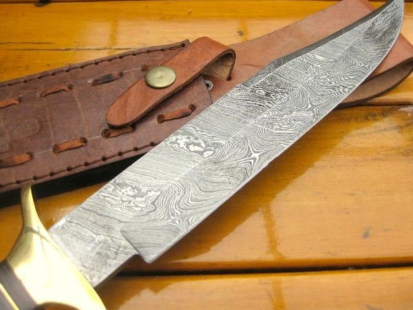 If you have been looking for that Custom knife to carry that will turn heads whether in the sheath or out, this knife is for you! The guard/bowter is made of SOLID POLISHED BRASS. The bowie knife is 354mm overall length and the blade is 221mm long, and 5mm thick.