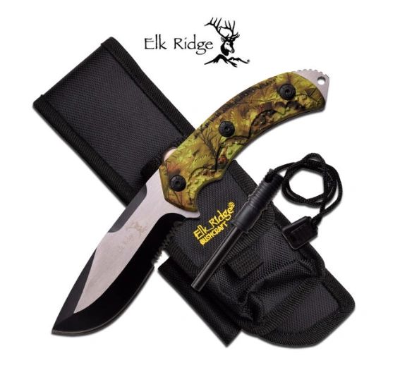 ELK RIDGE - CAMO SURVIVAL KNIFE + FIRE STARTER - HUNTING BOWIE SKINNER + SHEATH