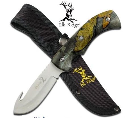 ELK RIDGE - SYNTHETIC CAMO Handle with GUT-HOOK Elk Ridge Knives presents the ultimate hunting knife. Boasting a 100mm 440C stainless steel blade with the Elk Ridge logo and a synthetic CAMOE handle for a mighty 229mm overall length! The ultimate sportsman gift, gift for him, gift for anyone - anytime! ITEM POSTED VIA EXPRESS REGISTERED POST