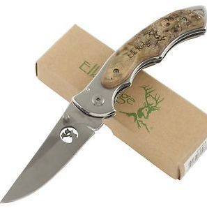 This is the Elk Ridge Mirror Finish folding linerlock pocket knife. It measures 4 1/2" (114mm) closed and 7 5/8" (193mm) open. The mirror polished 440 stainless steel drop-point blade is 3 1/8" (79mm) long and has a laser cutout of an Elk. The handles are maple burl wood with a rich wood grain.