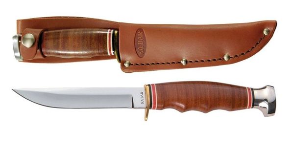 The 1232 Ka-Bar is a classically styled hunting knife that has been popular since the early 1900's. It features a polished stainless steel Bowie blade with hollow grinds. The brass guards and stacked leather handle are complemented by colored spacers and an aluminum pommel. Includes a brown leather KA-BAR sheath.