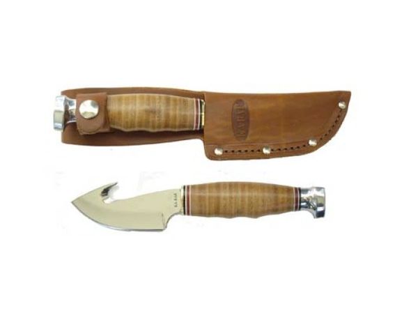 KA-BAR Game Hook Hunter Clasically styled leather-handled hunting knives have been popular since the early 1900s. The Game Hook is a modern take on this classic style. Dressy enough for gift giving and practical for field use. Brown leather KA-BAR sheath included. ABOUT KA-BAR... KA-BAR Knives, Inc., a subsidiary of Alcas Corporation, manufactures high quality military, hunting, sporting, and all-purpose utility knives. HOW KA-BAR GOT ITS NAME... There have been many versions of how the KA-BAR name came to be, but all evidence points to a letter received from a fur trapper. He wrote, in very rough English, that his gun had jammed and that he had therefore relied on his knife to kill a wounded bear that was attacking him. In thanking the company for their quality product the trapper described using his knife to kill the bear. All that was legible of his scrawled writing was "k a bar". The company was so honored by this testimonial that they adopted this phrase and used it as their trademark, KA-BAR. Specifications Blade Length: 3-1/4" Overall Length: 7-1/4" Edge Angle: 20° Shape: Game Hook / Gut Hook Steel: DIN 1.4116 Stainless Steel Grind: Hollow HRC: 55-57 Handle Material: Leather Butt Cap / Guard: Brass Sheath: Leather Manufactured: Taiwan