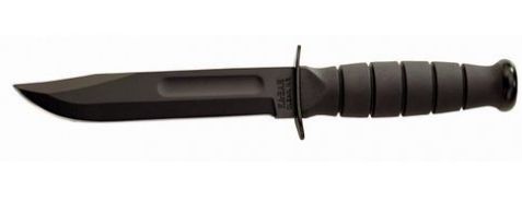 Ka-bar USA Fighting Knife. Plain Black. 12" overall. 7" black epoxy powder coated carbon steel blade with blood groove. Black Kraton G handle with black epoxy powder coated carbon steel guard and butt. Black leather belt sheath.