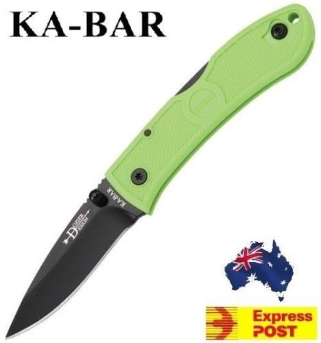 Ka-Bar Dozier Mini Folder (Bright Green) - Award-winning lock back designed by Bob Dozier is an affordable, practical all-purpose knife, with the bright green scales it won't be difficult to find when dropped.
