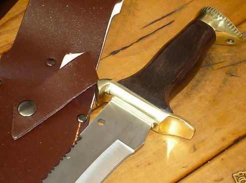 It has polished SOLID BRASS GUARDS, dark wood grip and a 440 GRADE STAINLESS STEEL BLADE