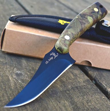 This is the Elk Ridge Camo Trailing Point Knife. It is a full tang knife made of 440 stainless steel and measures 6 7/8" (174mm) overall. The black finished razor-sharp blade measures 3 1/4" (82mm) and features a thumb ramp and a narrow handle neck.