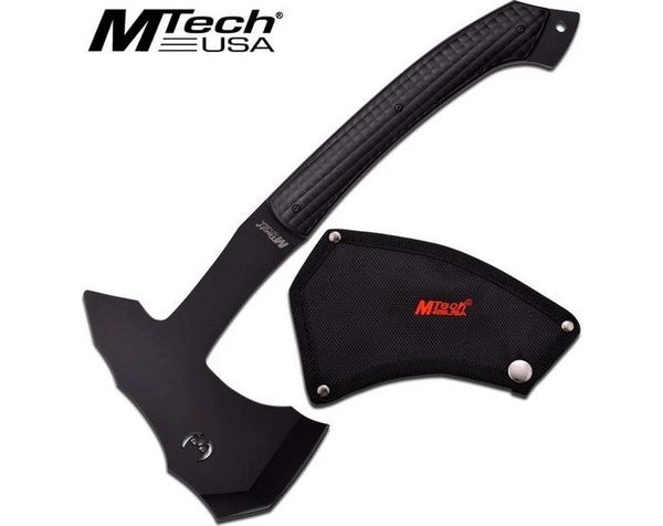 The MTech Black Skull Tactical Tomahawk is full tang, 440 stainless construction. The end of shaft features lanyard & another spike ideal for use as an impact device. Handles are black checkered composite. Comes complete with heavy duty nylon sheath.
