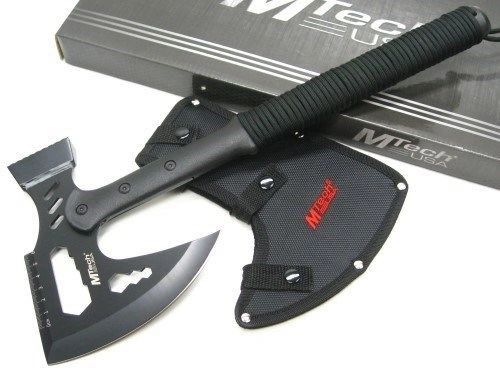 16 3/4" overall. 6 3/4" black finish stainless axe head with 6" cutting edge and hammer. Black composition handle with black cord wrap. Black nylon belt sheath. Made in China.