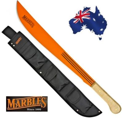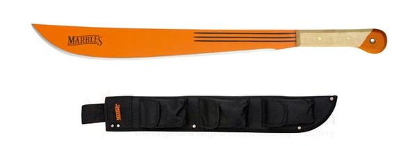 Marbles Knives - Machete with Wood Handle: Model MR-12718. 24" overall. 18" orange finish blade. Natural wood handle. 1070 Carbon Spring Steel. Bulk packed. Made in El Salvador.
