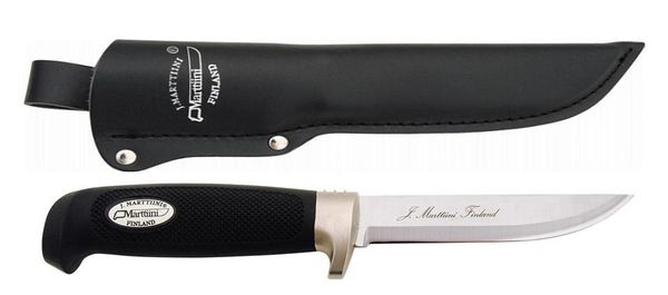 Marttiini Basic Hunter. 9" overall. 4 1/4" 420 stainless straight hunter blade. Black textured Kraton handle with a cast metal coated finger guard. Black leather belt sheath. Factory Box. Finland