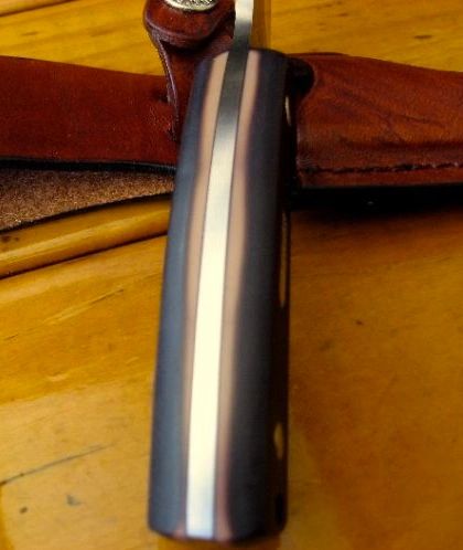 Schrade Old Timer Sharpfinger. 7" overall. 3 1/2" stainless blade. Full tang. Brown sawcut Delrin® handles with Old Timer® inlay shield. Lanyard hole. Brown leather belt sheath.