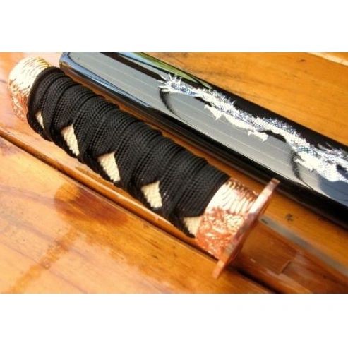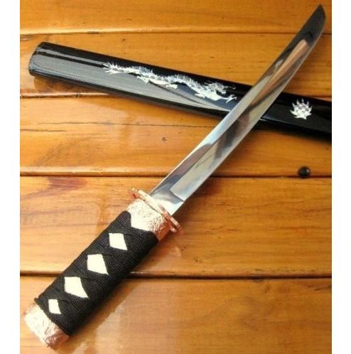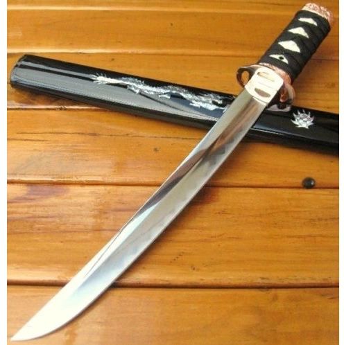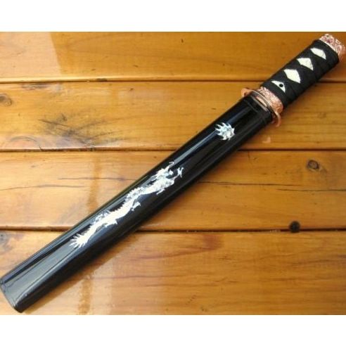 Now you are looking at a NEW classic Japanese samurai short sword. This sword is based on the idea of a classic style sword at an affordable cost. The blade of the sword is 440 stainless steel with the traditional hamon and curved blade. The scabbard of the sword is ALUMINIUM with two zinc aluminium fittings on each end and is ALLOY PLATED with satin finish. The handle of the sword is nylon cord wrapped for exceptional handling. The pommel of the handle is decorated with dragons around and one on the top. This classic sword is perfect for the martial artist! The high quality and the affordable price make it an absolutely good buy. You can't find a better deal than this!