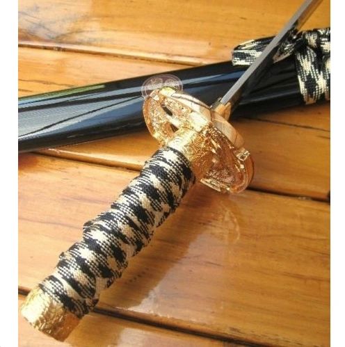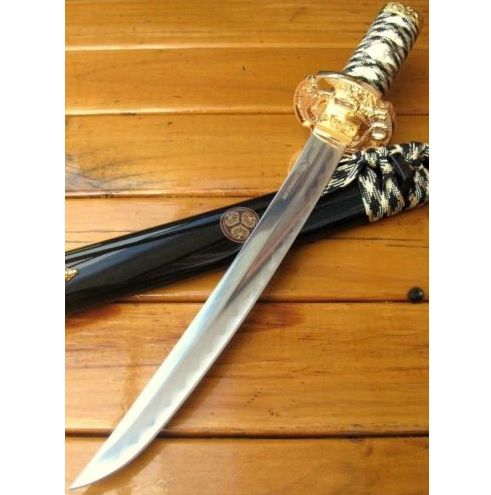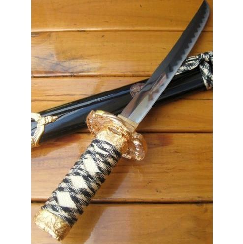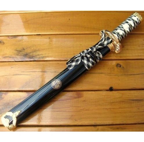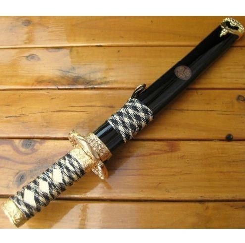 THESE ARE QUALITY MADE SWORDS AND WE GUARENTEE 100% CUSTOMER SATISFACTION! Now you are looking at a NEW classic Japanese samurai short sword. This sword is based on the idea of a classic style sword at an affordable cost. The blade of the sword is 440 stainless steel with the traditional hamon and curved blade. The scabbard of the sword is ALUMINIUM with two zinc aluminium fittings on each end and is ALLOY PLATED with high gloss gold finish. The scabbard throat fitting is a scene of samurai in the forest cast into the steel. The end cap of the scabbard is a demon with its wings spread and a flower above it. The guard of the sword is a dragon and 2 samurais fighting with each other. The handle of the sword is nylon cord wrapped for exceptional handling. The pommel of the handle is decorated with dragons around and one on the top. This classic sword is perfect for the martial artist! The high quality and the affordable price make it an absolutely good buy. You can't find a better deal than this!