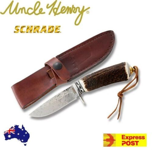 The limited edition uncle henry drop point hunter by Schrade cutlery has a stag horn handle (Sambar Deer, NOT A PROTECTED SPECIES) and a Damascus steel blade. This is well suited for skinning and slicing, and the display box is an excellent way to show off this beautifully designed hunting knife.