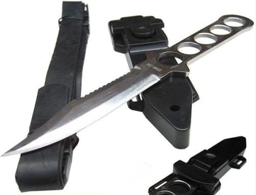 STAINLESS STEEL - DIVE DIVING KNIFE + RUBBER LEG STRAPS This extremely corrosion resistant knife measures 218mm overall. The 4mm thick blade is 103mm long sharpened on one side and a 45mm serration on the upper side. The handle has lightening cutouts that provide extra grip. It comes with a impact resistant snap-in self draining sheath. Also includes 2 x rubber straps with quick release buckle for wearing on the arm or leg. BRAND NEW IN BOX!