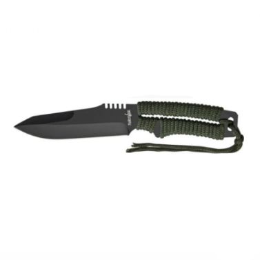 Misc Survivor Fixed Blade. 10" overall. 5 1/4" blade with small sawback. One-piece black finish stainless construction with olive green cord wrap and lanyard. Survivor tang stamp. INCLUDES Black nylon belt sheath.