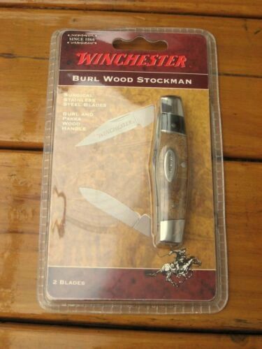 The Winchester 2 Blade Stockman Knife features clip and pen blades made of stainless steel. The blades have nail nicks for opening, and the clip blade has the Winchester logo etch. The two tone BURL wood handle of this Winchester knife, 3 1/8" closed, has metal liners, inlaid Winchester shield and stainless steel bolsters.